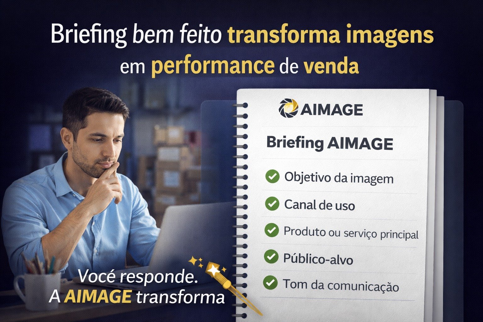Você responde o essencial. A AIMAGE transforma isso em imagens prontas para vender, informar ou comunicar.